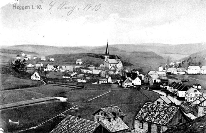 Ein Postkartenfoto vom Ortskern Heggen um 1910 aus östlicher Richtung.